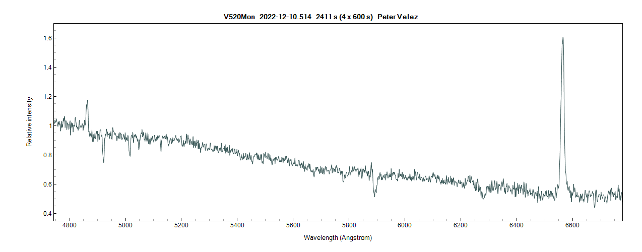 Two spectra from last night - one taken in the UV, the other in the visual spanning H beta to H alpha. Resolution of around 1000 - taken with UVEX using a 600 lines/mm grating through a Planewave CDK 12.5. Happily - all automated while I slept as it was only observable in the early hours of this morning.