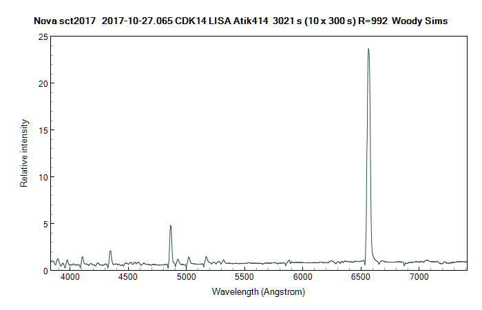 Salut, juste Joan, même la nuit dernière 23-10-2017, avec de nombreux problèmes météorologiques, j'ai réussi à faire un spectre à la nova.Voici son profil spectral et une comparaison avec 21-10-2017.