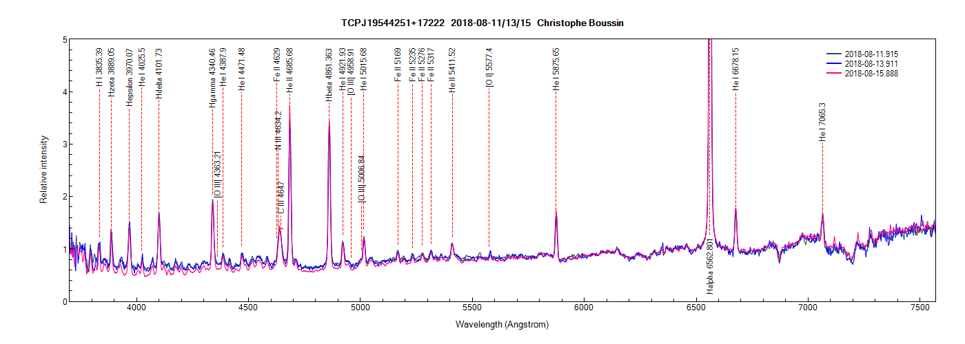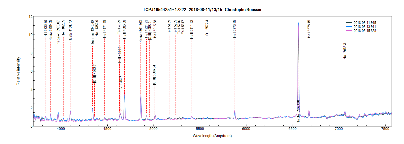 The 13/08/2018 spectrum, Lhires III 600 l/mm. A slight better resolution (better thermal stabilization of the spectrograph) were reached respect to my last observation. No apparent evolution compared to 11/8 spectrum.