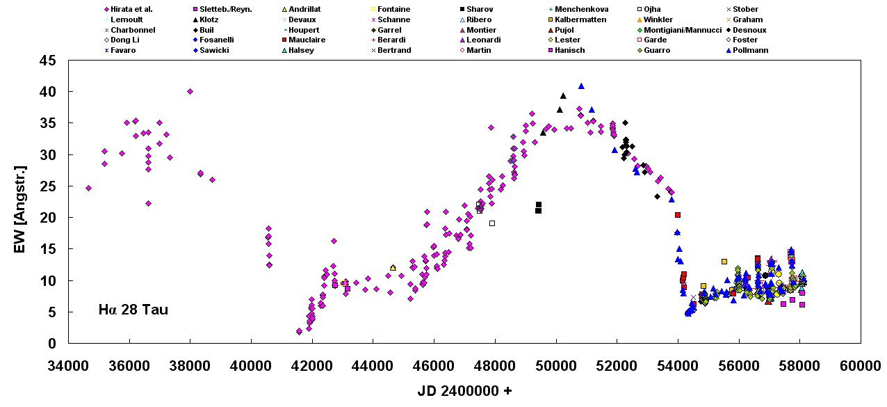 The attached diagram shows in our study the relationship between the Halpha line flux and the V-brightness of 28 Tau. Therein, the line flux is derived from the Halpha equivalent width (see definition on the ordinate; EW measured from spectra of ARAS observers; Vmag measured by W. Vollmann, Vienna).