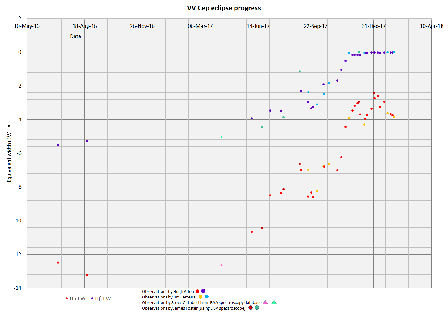 Latest update to my chart of Hα and Hβ Equivalent Widths. Thanks Jim Ferreira and James Foster for providing their spectra so that we have much better sampling of the two curves. The Hα curve had been showing a general decline overlaid by periodic re-brightening in line with Ernst Pollmann's high resolution results. The latest results are deviating from that pattern. Perhaps a sign that deepest eclipse of the Hα region has now been reached?