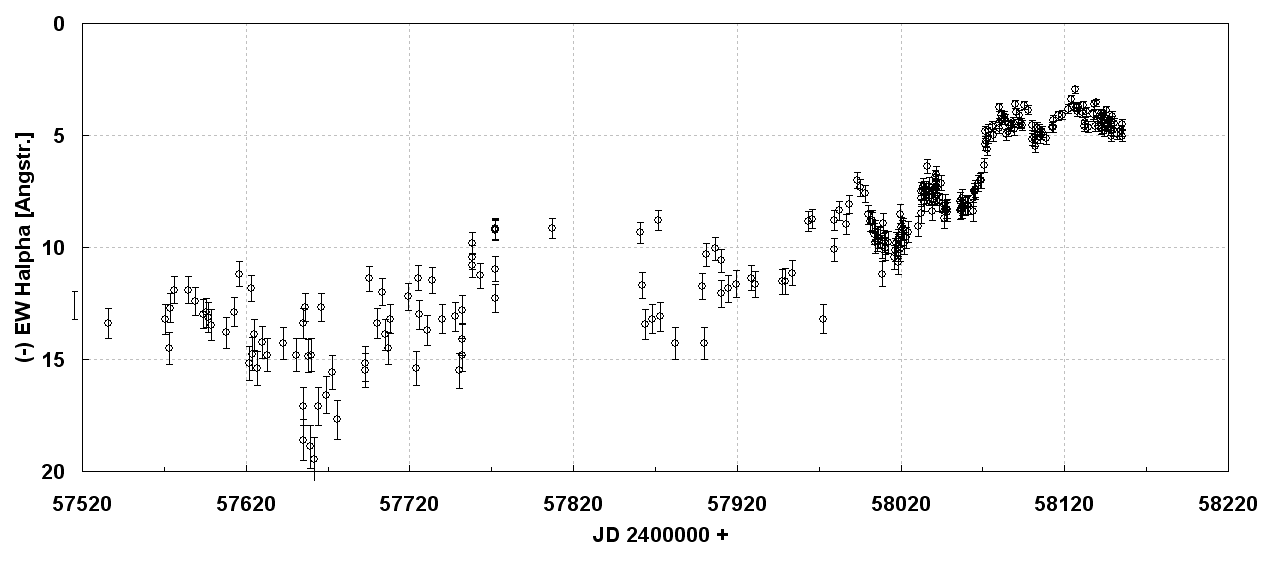 in order to compare your graph with the total ARAS EW monitoring, I have drawn it for the same time section as yours. As you can see, there is an certain agreement of the variabilty in your diagram to ours. The deviation of yours to the ARAS monitoring is caused maybe by the clear lower spectral resolution of your used spectrographs. The integration interval of EW determination of the ARAS monitoring is between 6551 to 6573 Angstr. The accuracy of the EW measurements is (+/-) 5%. Could you say something about the interval and the accuracy in your diagram?