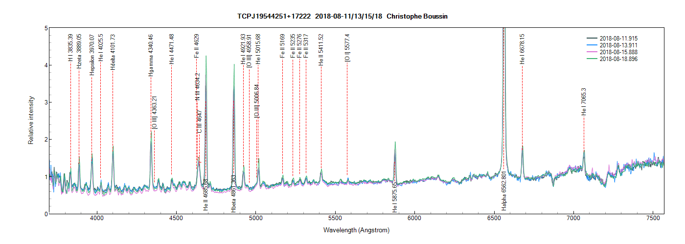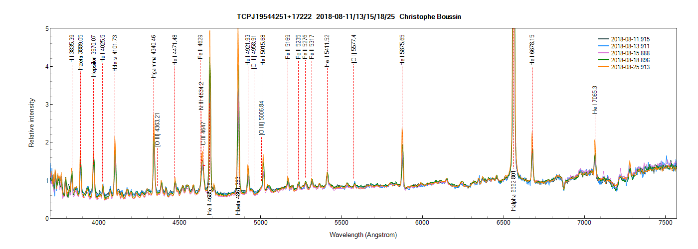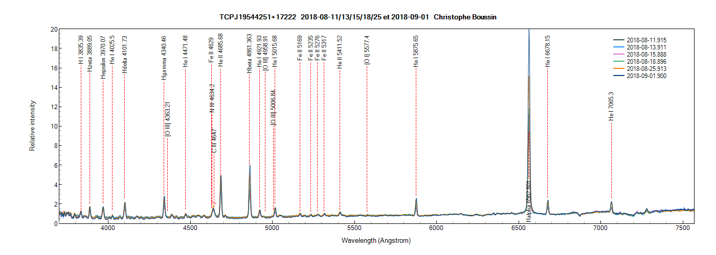 The comparison of the spectra obtained between August 11 and September 1st clearly shows an increase in the relative intensity of the Balmer lines since August 18.