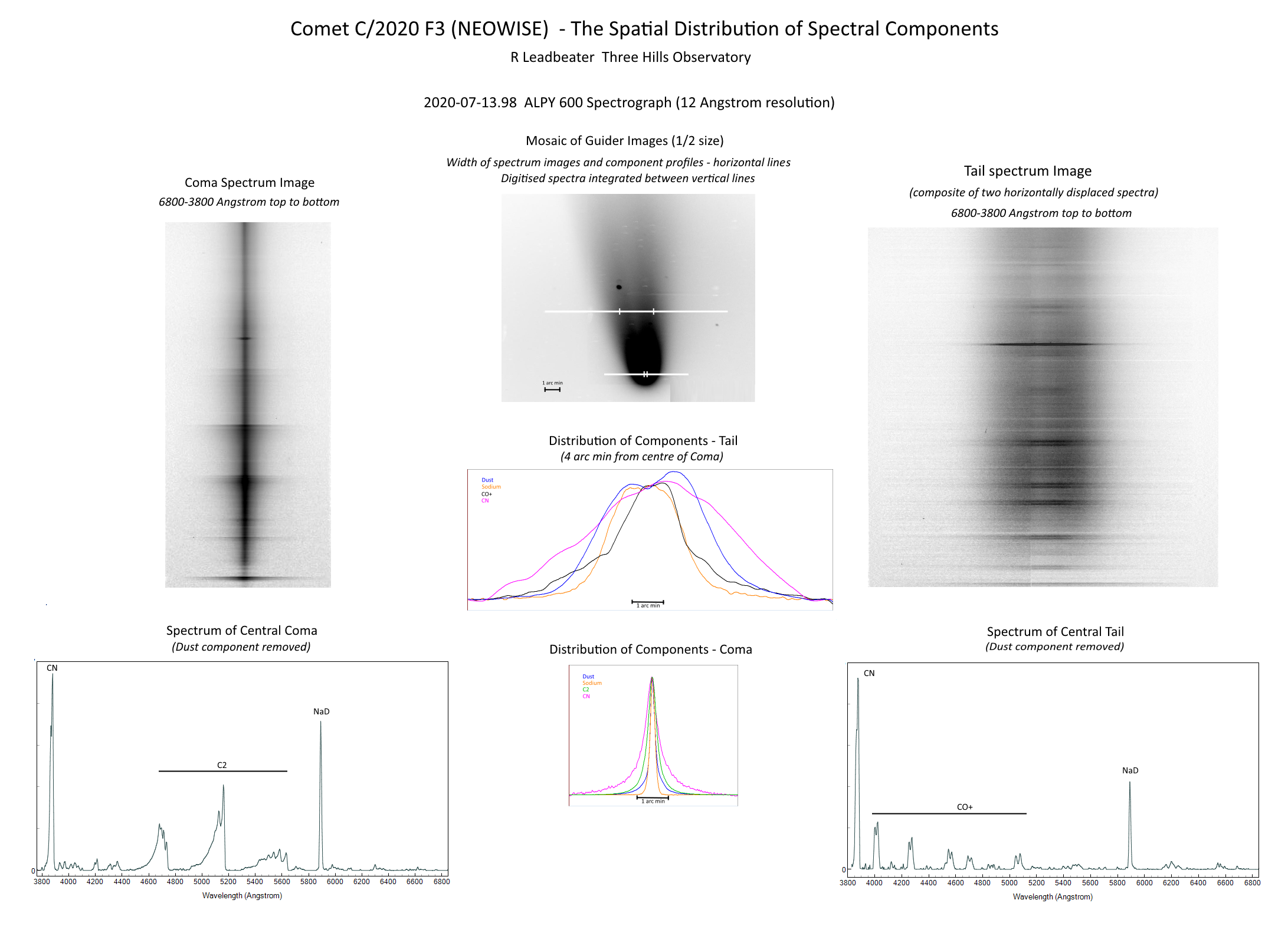 The CN and Sodium components are seen in both coma and tail but the C2 component which dominates the coma emission spectrum is absent in the tail, replaced by the CO+ component.