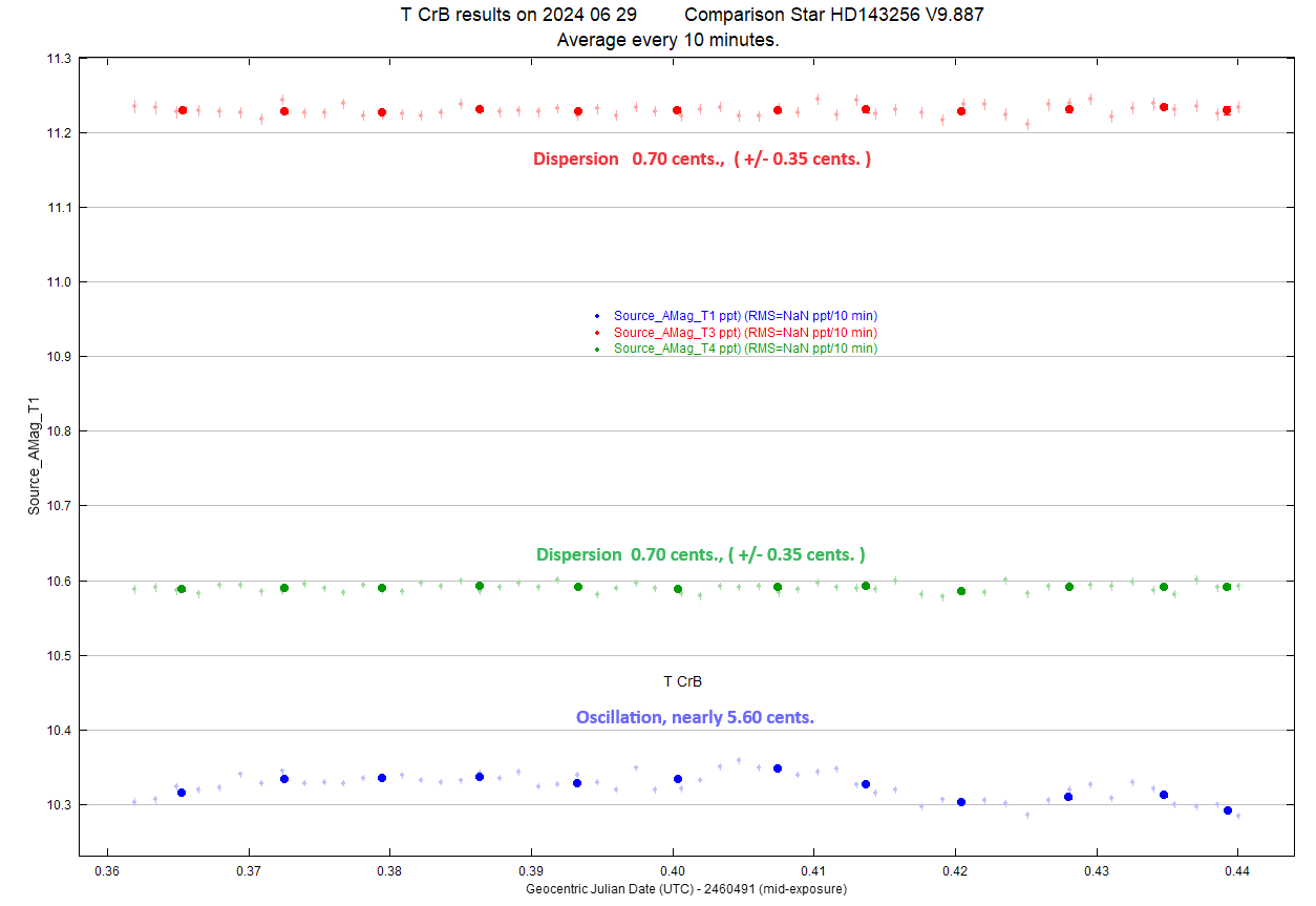 With this equipment, and meanwhile, I was taking spectroscopy to T CrB, I took advantage of taking photometry of this star too. You can see some pictures of it, if you need more information don't hesitate to contact me.