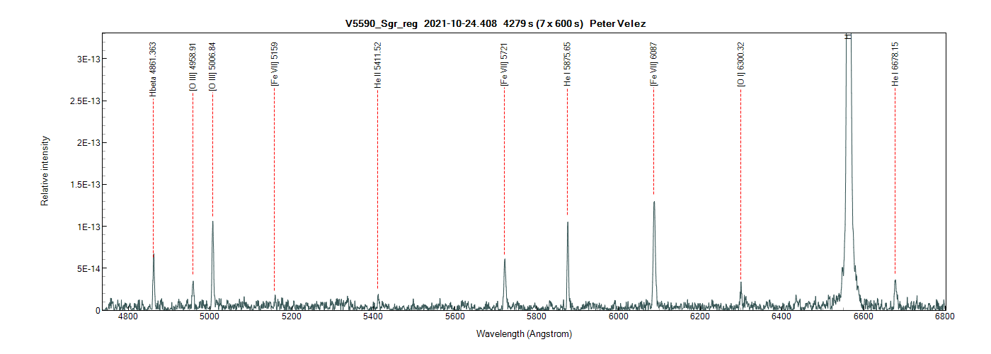 V5590 Sgr (Peter) - symbiotic star, very strong [Fe VII] in the spectrum. Peter, this is not anyhow embarrassing, that you reobserved the target, actually, this was great that you did it! [Fe VII] lines in your spectrum from last year were rather weak, so only the spectrum obtained now undoubtedly confirms symbiotic nature.