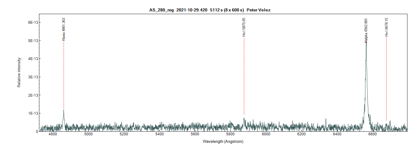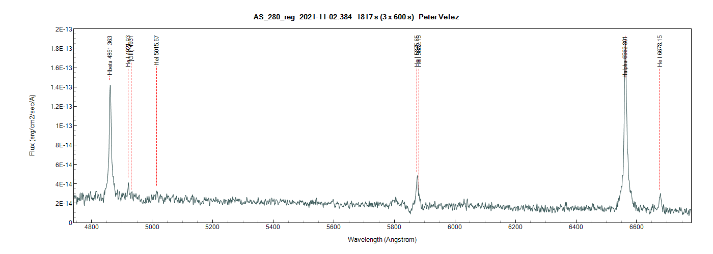 AS 280 (Peter) - the emission line at 5876A is neutral helium. I would suggest observing the region covering the ionized helium line at 4686A, which is the strongest in the spectrum.