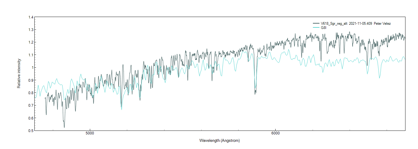 The continuum is a distracting element of my spectrum. It was taken late in the season. I managed 2 exposures of 10 minutes with the target at airmass 2.6 at the beginning of the run. The reference star was a bit higher at airmass 2.3. Clearly there is atmospheric differential refraction at work here. I attach a plot comparing this spectrum to a MILES G8I star and its a reasonable match but for the dodgy continuum.