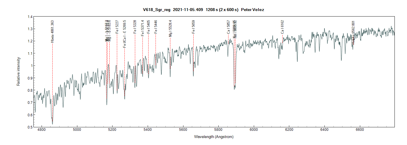 Simbad records V618 Sgr as a R CrB star - the dip in brightness and subsequent climb in the lightcurve is consistent with that. Terry's spectrum was taken as the star had not yet hit its minimum brightness while my spectrum was taken as it was nearing its normal brightness. There are no emissions. I've had a stab at identifying the absorption lines in the attached plot. If you disregard the continuum, the closest analog I could find was a late G star - again consistent with the R CrB identification which generally presents as an F or G supergiant.