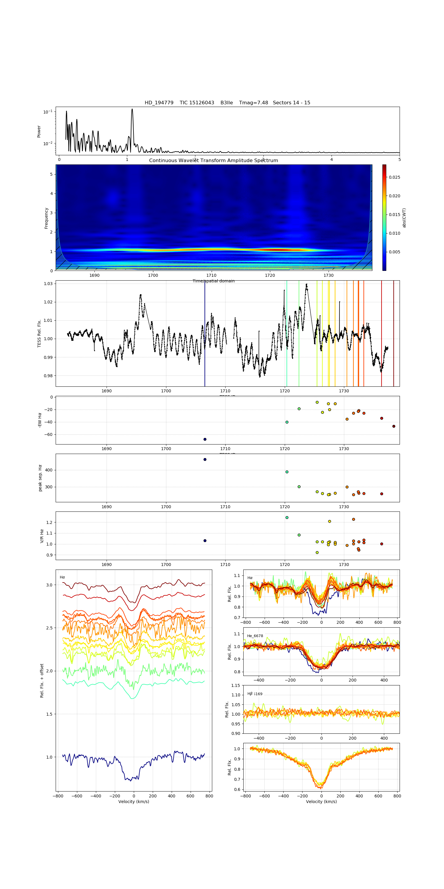 Here is a summary of what all this is telling us. The TESS data (via the top two frequency plots) show a strong signal near 1.1 cycle per day. This signal is strongest near TESS_JD = 1720 (easy to see in the wavelet plot, and you can also see this by eye in the LC). This is probably the dominant pulsation mode, and is typical for Be stars. There is another significant frequency just below this, at about 1 c/d. The TESS light curve also shows other slower variation (at low frequencies). This is obvious by eye if you look at the LC, and you can also see these signals in the frequency spectrum (the power at low frequencies). Some time between the first and second spectrum the star starts to build a weak disk, seen in Halpha. This disk then dissipates over the next ~3-4 weeks. You can see this in the Halpha line profile, the peak separation, and the EW.