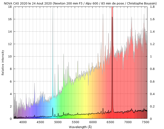 With a less favorable weather than at OHP, I think, I have, I obtained the following spectrum of the nova Cas 2020 the 24th of August at 22 h 51 TU with my Alpy 600 (resolution of 501, JJ = 2459086.4521) and an acquisition time of 85 min :