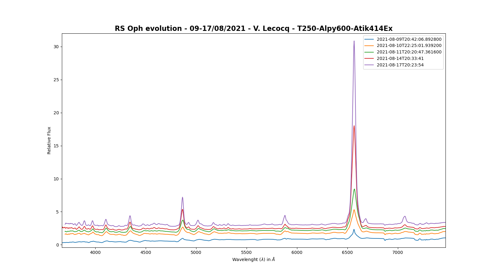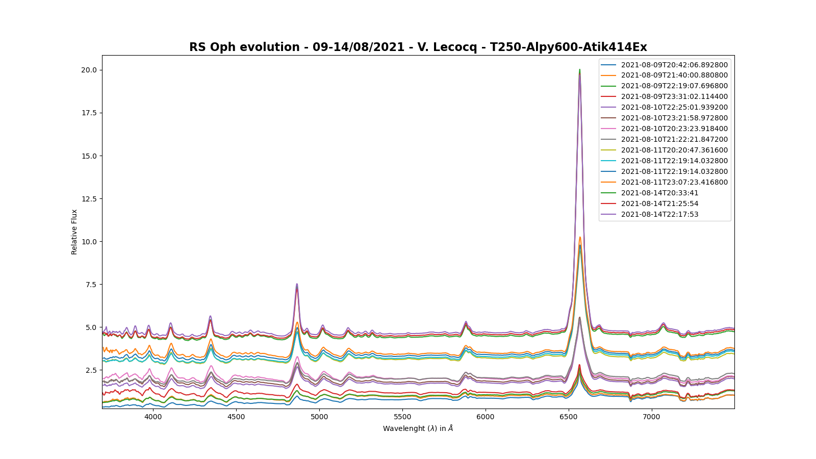 Here is a comparison between my three last spectra the Halpha line of RS Oph at high resolution on August 12 at 21 h 24 TU (resolution of 16932, JJ = 2459439.3915, acquisition time of 70 min (7 x 600s)), on August 19 at 22 h 19 TU (resolution of 18039, JJ = 2459446.4296, acquisition time of 10 min (1 x 600s)) and on August 20 at 21 h 12 TU (resolution of 18575, JJ = 2459447.3835, acquisition time of 50 min (5 x 600s)) obtained with my LHIRES III (grating of 2400 lines / mm) and the previous one, on August 11.