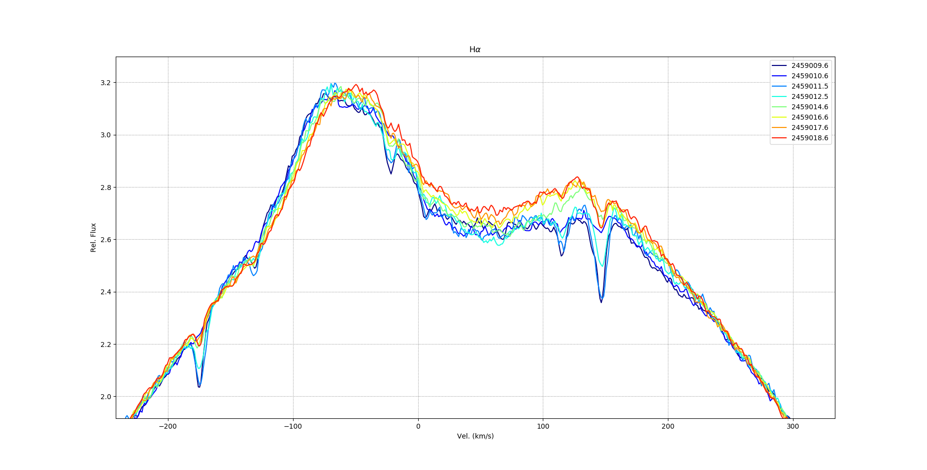 Then the rest are some spectroscopic features when available. All the BeSS spectra cover Halpha. The big Halpha panel has time increasing upwards, with spacing scaled to the time between observations. There isn't much change in the profile of the Halpha line, but it clearly starts to decrease in strength in the first half of the dataset, then increases again. This effect is actually not caused by the Halpha emission line changing. Rather, it is the underlying continuum that is increasing, while the line emission remains relatively steady (could be increasing actually, but more work needs to be done to attempt to measure this properly).