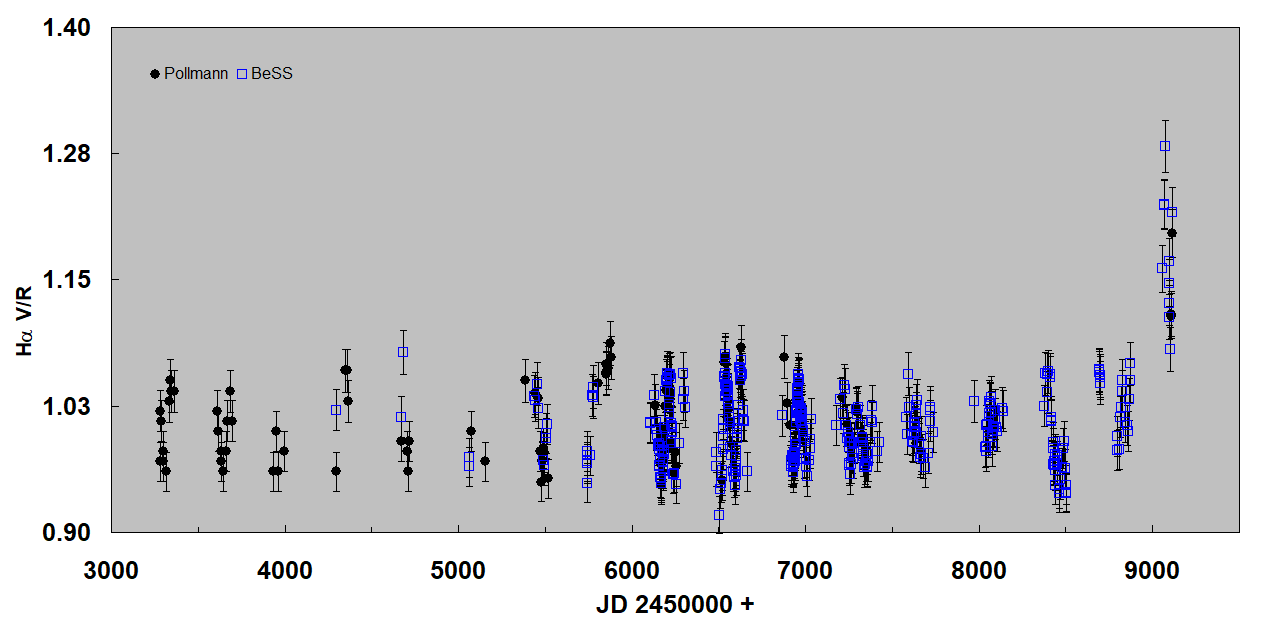 Thanks for these plots. I was aware of the recent (over the past many years) evolution of the Ha EW (thanks to similar plots that you have shared), but the more recent and dramatic evolution of the Ha V/R variation is news to me and is definitely interesting. I've talked about some observing programs to monitor Pi Aqr recently (on here and the spectro-l mailing list), and I've been getting regular NRES spectra over the past ~100 days (and am continuing these observations), plus we have been getting nightly (weather permitting) sequences of polarimetry data in Brazil over the past month. The ~80d V/R variability from the binary orbit looks clear in your V/R plot, and the recent larger-amplitude trend of V > R is something I've also noticed being NOT phase locked to the binary orbit (rather its evolution is much slower). Having this historical dataset that you show adds some nice context to this new behavior.