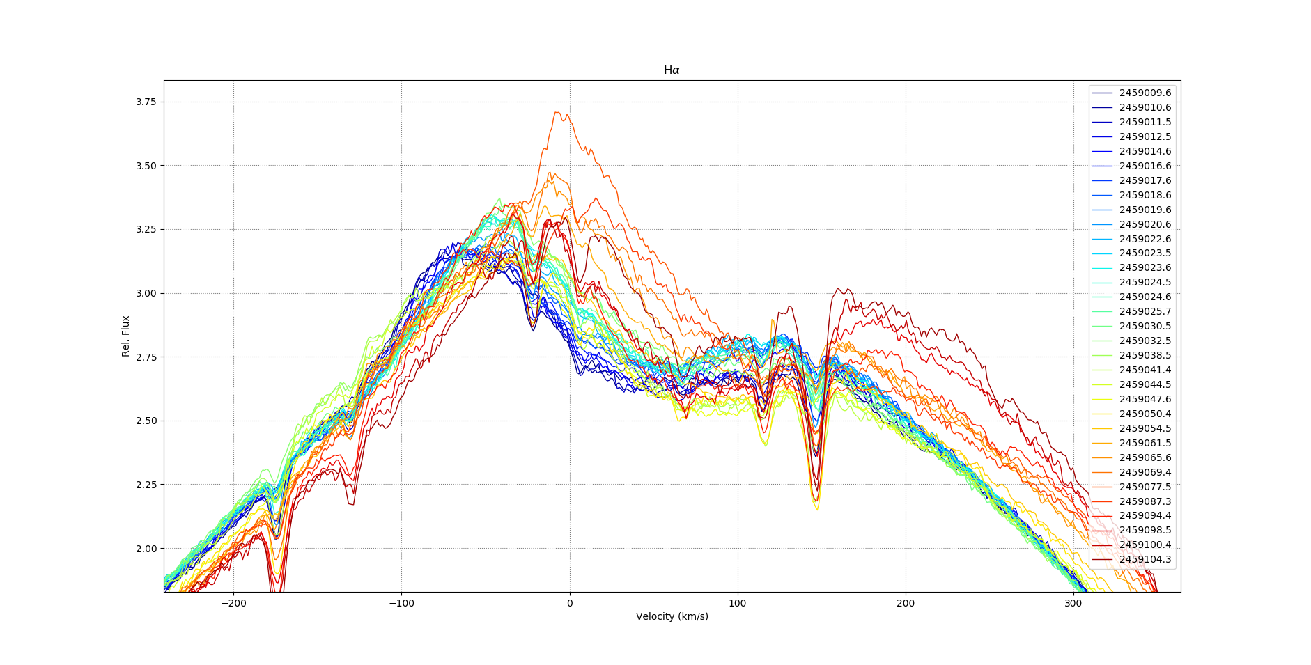 Just out of curiosity, have you measured the Halpha peak separation to see how that changes over the orbit? Some other similar systems I'm aware of have the peak separation follow a sinusoid at half the orbital period due to the density structure of the disk. At some point this will be done with the NRES spectra, which I think will be a useful quantity for Amanda's models of the disk, but so far I haven't done any sort of quantitative measurements.