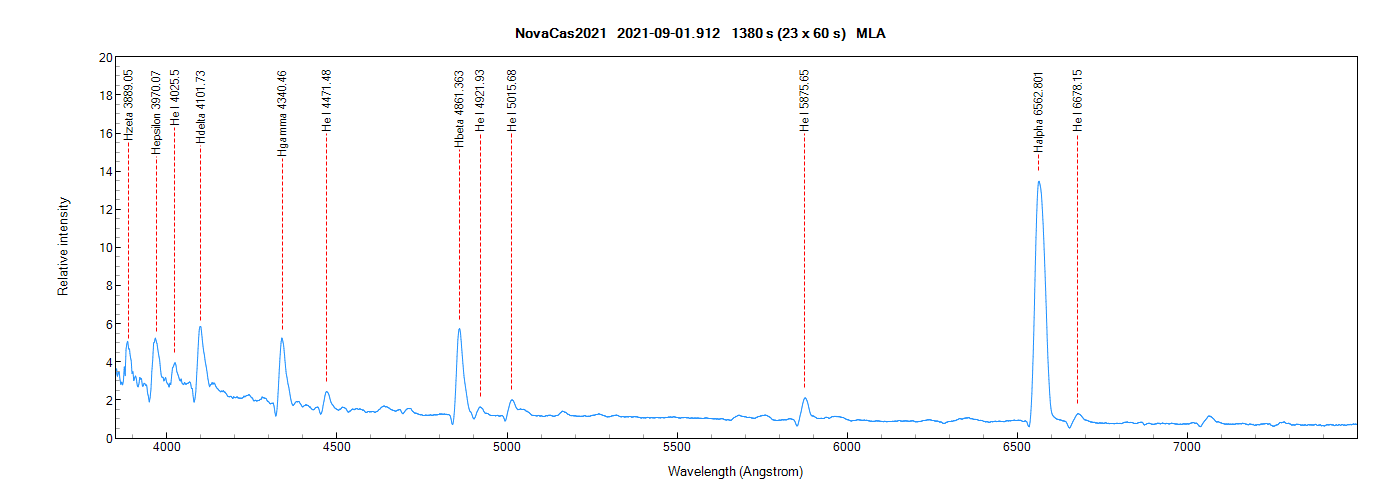 I obtained a new high resolution spectrum of the Halpha line on September 9 at 21 h 00 TU (resolution of 18373, JJ = 2459467.3754, 7 x 600s) with my LHIRES III (grating of 2400 lines / mm) and, according to the AAVSO, the magnitude of Nova Cas 2021 was about 6.5 at that time !