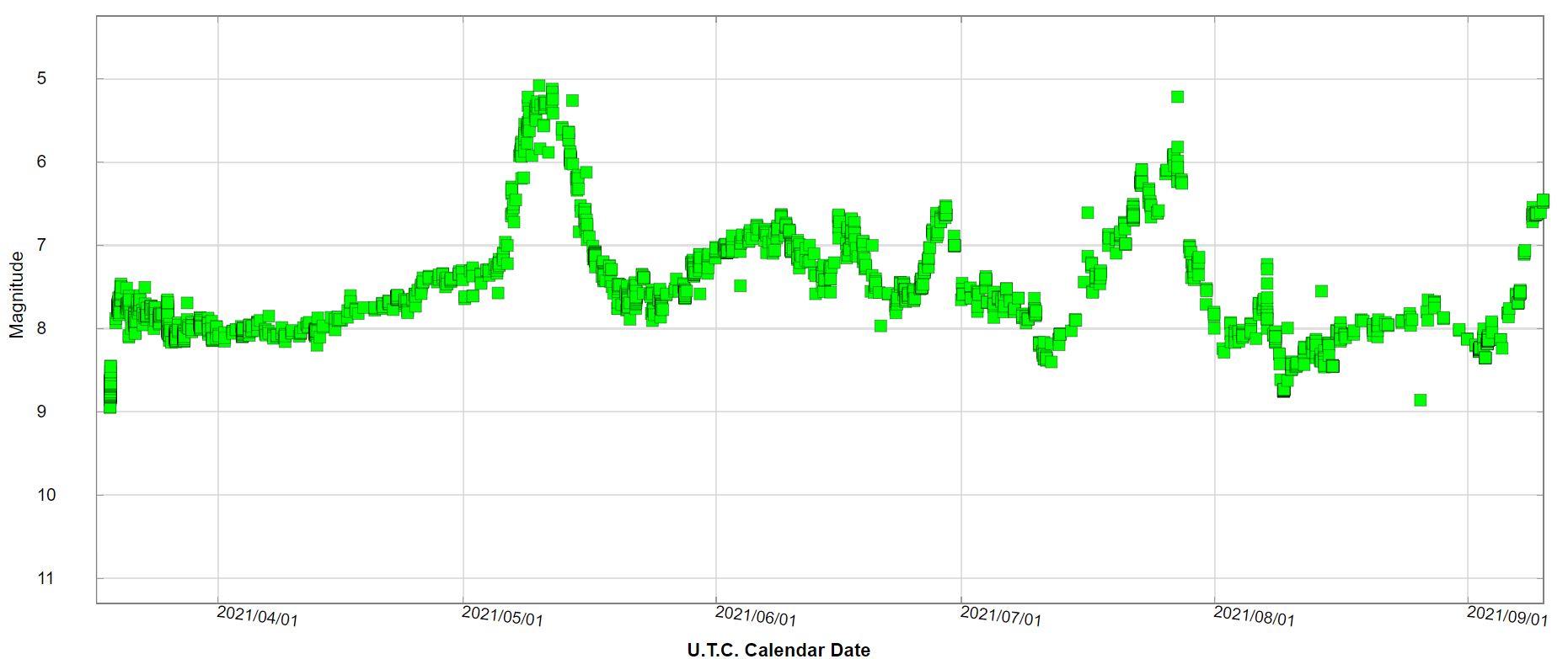 Hi Christophe. Maybe some kind of inhomogeneity in the fireball ?Christophe Boussin wrote:We can clearly note the appearance of this peak around August 27 and its almost total disappearance around September 6....What happened then ?