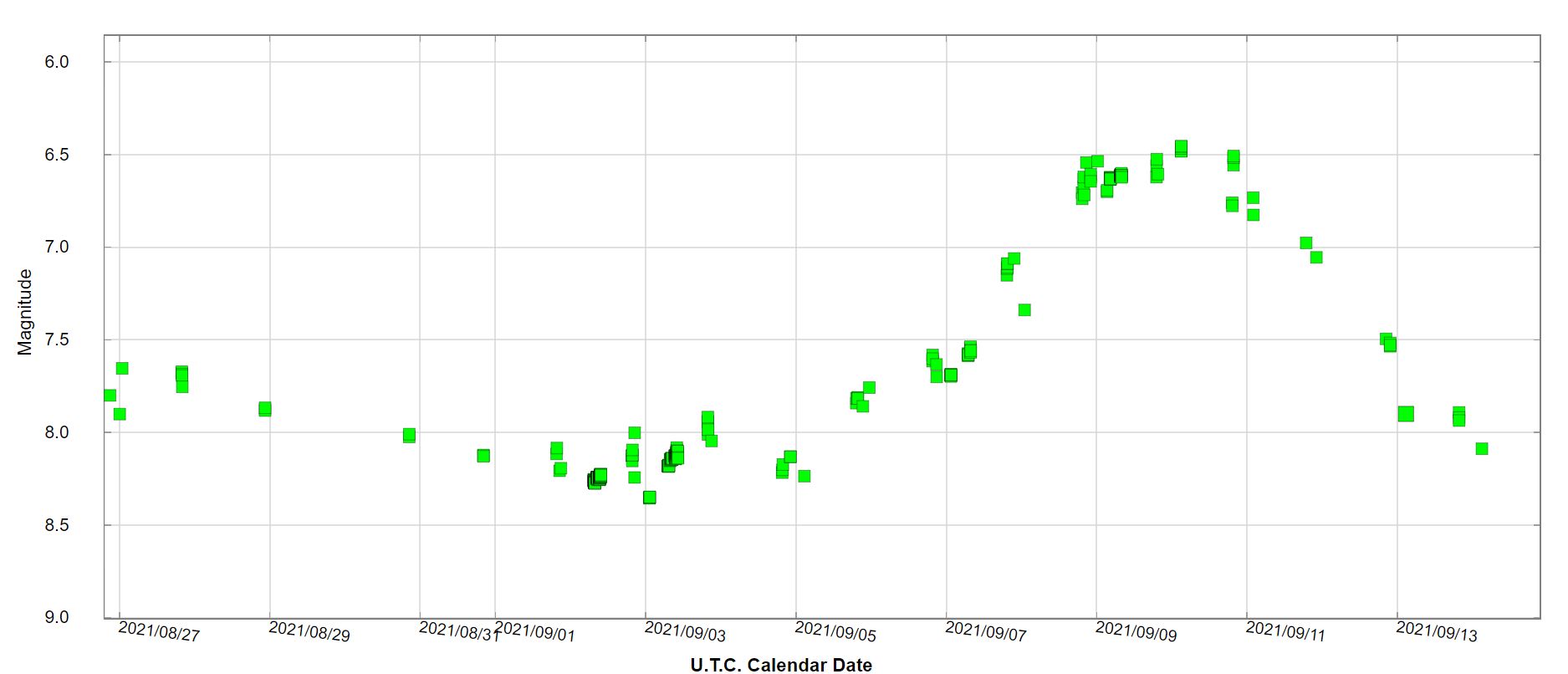 The light curve shows that Nova Cas 2021 had a new maximum of luminosity around September 9-10 with a magnitude of about 6.5 !!