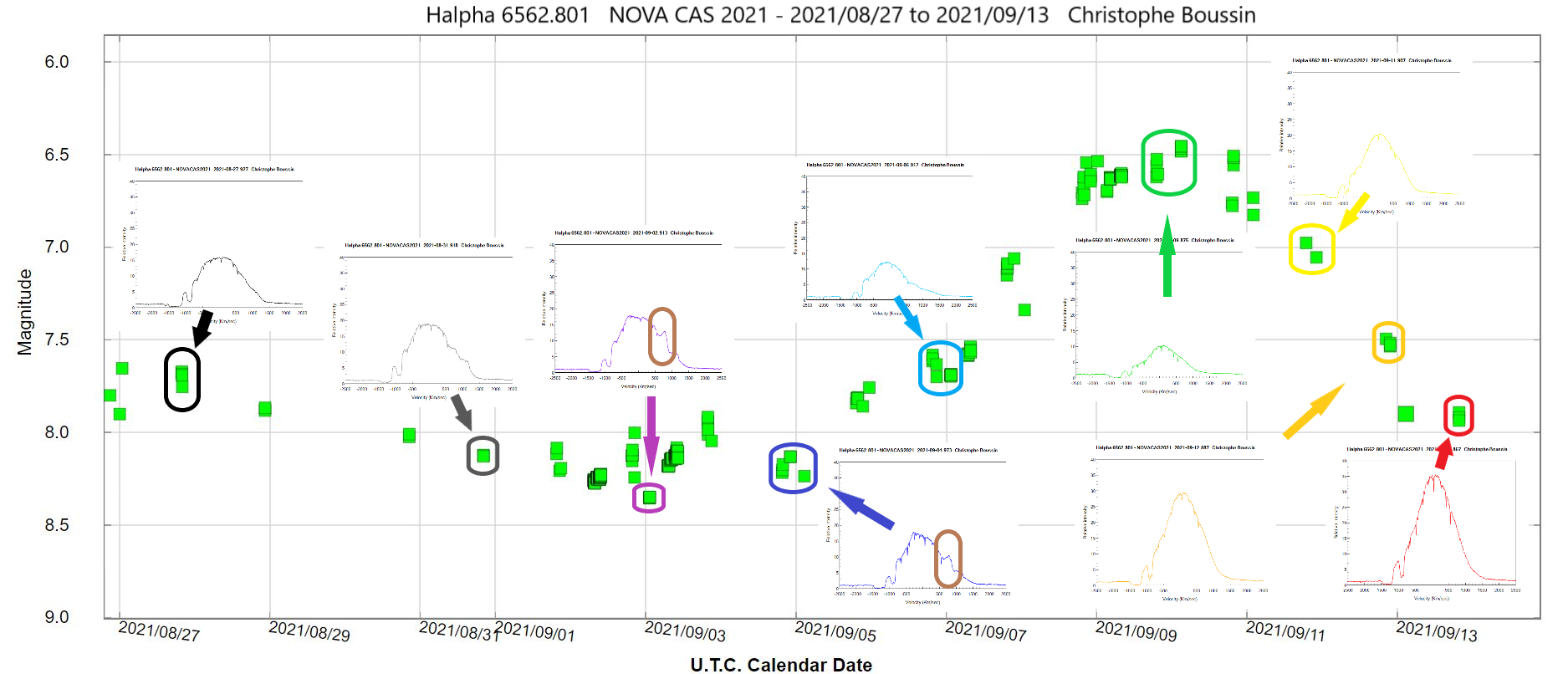 We can notice the decrease of the relative intensity of the top of the Halpha line during the increase of luminosity between September 4 and 9 then its increase during the decrease of luminosity since September 9-10.