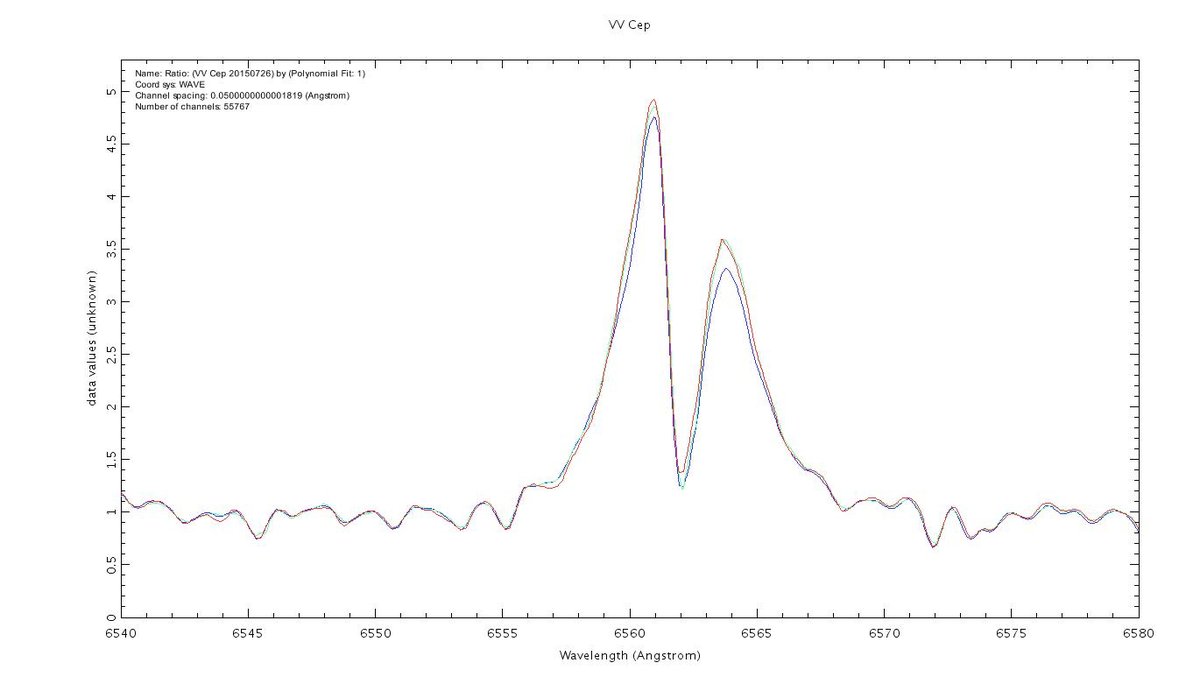 as VV Cep is a long term variable (20+ years), my intent was to get a spectrum every two weeks or so. But by comparing my last spectra, I realized that the Halpha emission was varying compared to the continuum: