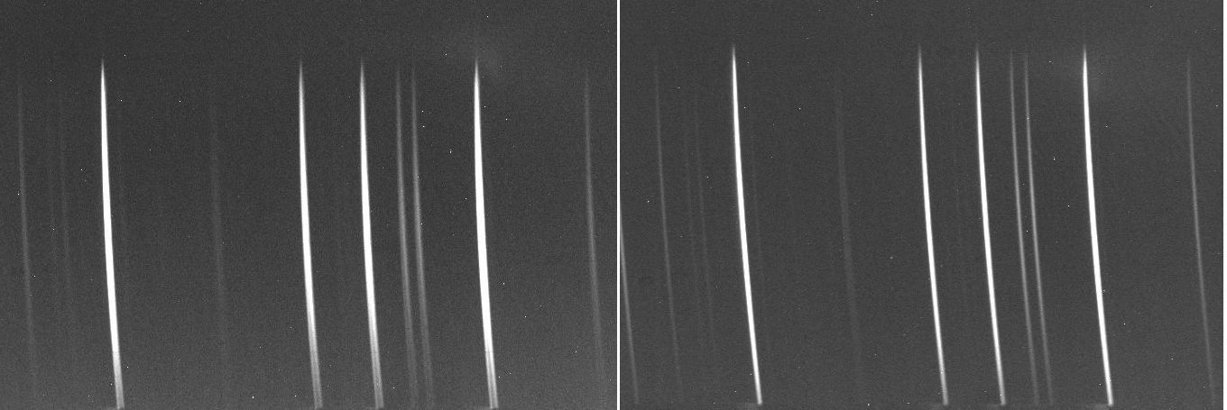 Every year about this time the focus of my LHiRes deteriorates rather significantly. It is, of course, temperature related. During the summer I get nice sharp focus, skinny and symmetric emission lines from the internal Neon-Argon source. But as the temperatures fall going into autumn, the focus slowly gets worse, with the lines showing a skewed shape (plotting a slice perpendicular to the line). By the time temperatures get into the low single-digits (Celsius) the lines are very out of focus, and no amount of doublet twisting can solve it. Eventually the lines begin to show a doubled shape, starting at the "bottom" of the image, but spreading upwards as the temperatures fall. A long time ago I figured that I'd try to loosen the clamps that hold the grating to its mounting plate, but despite that the problem remained. Until last night. It was nice and clear and cold so, of course, focus was terrible. In desperation I decided to revisit the grating clamps to see if they were still too tight. I was amazed. Basically I decided to loosen the machine screws so that the grating was only barely being held against its holder, just tight enough that I could shake it gently and it would not move. After replacing the grating I could not believe the difference. I'm not certain that was the only thing going on as, during the process, I may have moved the grating a bit in its holder - maybe it was skewed a bit. Anyway, I'd seen others with the same problem and read that loosening the grating clamps was a possible solution, but did not appreciate just how gently they need to be tightened - only enough to keep the grating from moving. Here are before and after pictures, taken maybe 20 minutes apart.