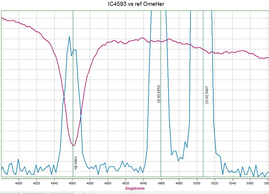 En complément d'information, voici une comparaison des spectres de l'étoile de référence (OmeHer) et de la nébuleuse IC4593 (zoom autour de 4861A).