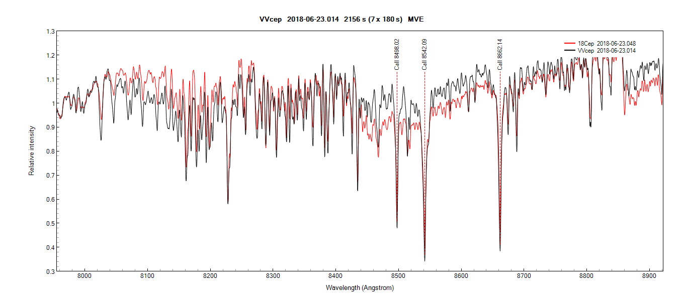 Et une comparaison entre V*V Cep et 18 Cep (M5III candidate variable à longue période). Les spectres semblent très proches de 7960A à 8900 A