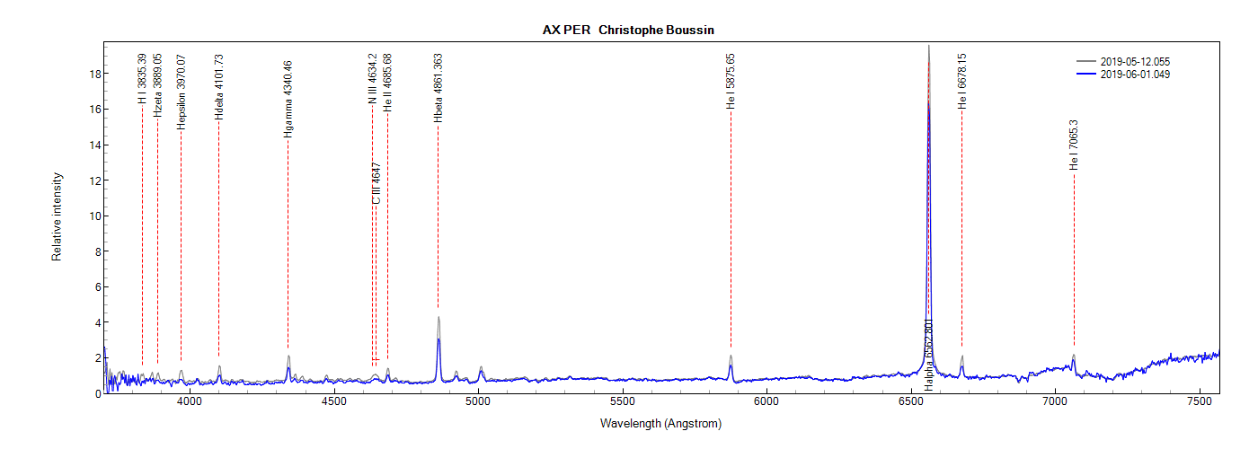 AX Per on May 12th and June 1st, 2019 (identification of some lines from PlotSpectra)