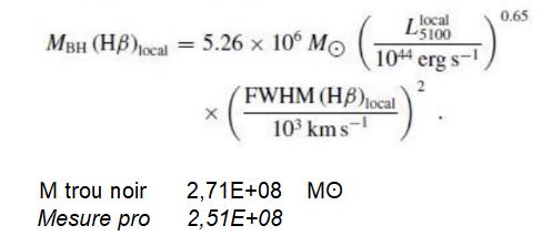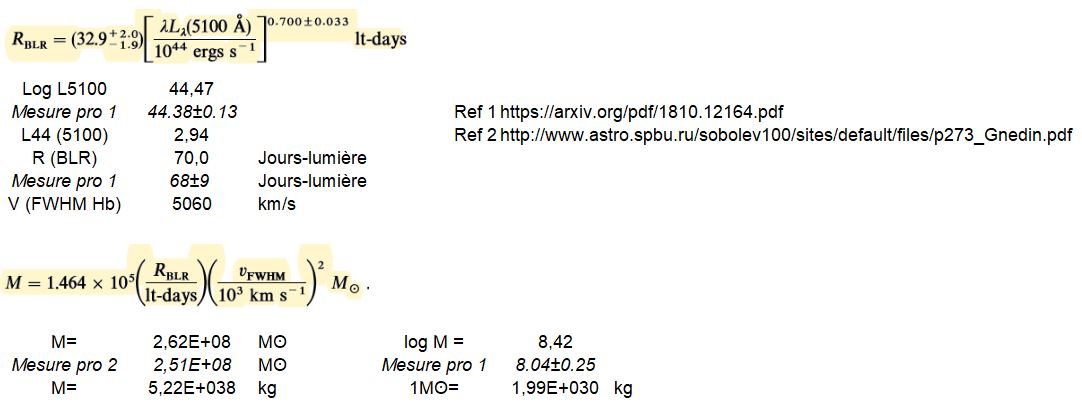 Dans la littérature on trouve différentes formules pour calculer M en fonction de L(5100) et FWHM(Hb). Je suppose que c'est en fonction des études plus ou moins affiné pour différents types d'AGN avec des mesures de plus en plus pointues ? J'ai refait le calcul avec la formule donnée par le papier d'origine (Kaspi et al, AJ, 2000) qui décrit la découverte de la relation R(BLR)-L(5100), et je retombe globalement sur le même résultat, ce qui est rassurant.