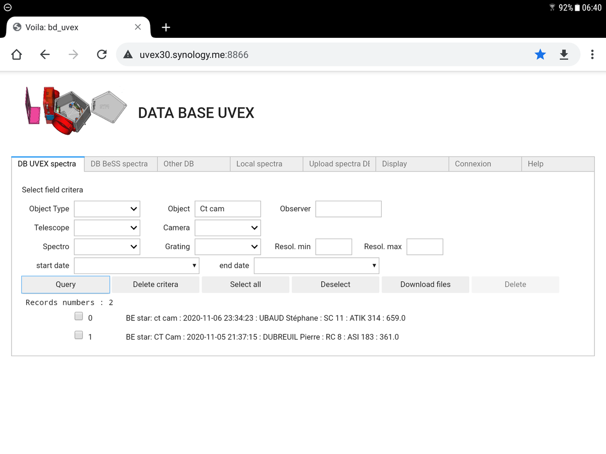 Page accueil avec beaucoup de critères de recherche. Une fois la ou les spectres cochés utiliser le bouton display. Au bas du display selectionner le menu déroulant de l'objet. Cela donne acces à l'entete fits . Exemple de mon dernier spectre GamCas ou la descente dans l'UV est impressionnante, étoile chaude 25000°K Vive UVEX