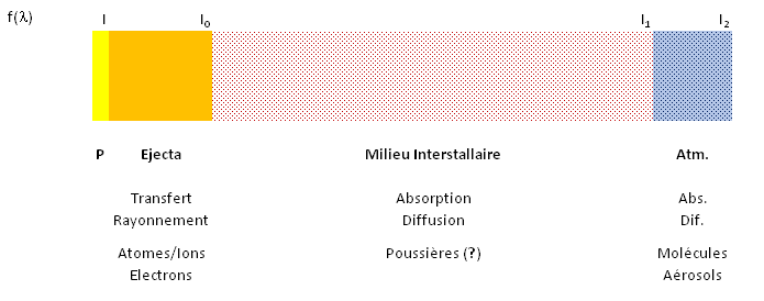 Les photons interagissent avec la matière ténue du milieu (poussières selon les connaissances actuelles) et sont pour une partie d'entre eux absorbés ou diffusés.