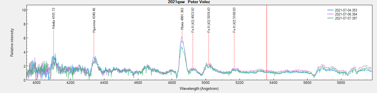 I attach a plot of my data from 4, 6 and 7 July. All spectra were taken with UVEX 600 lines/mm grating on PW CDK 12.5 with an Atik 460EX camera. Imaged from the iTelescope facility at Siding Springs Observatory Australia. Total integrations times varied from 4.5 hours (4 July) to 3 hours (7 July). I've had a stab at identifying a few of the more prominent lines but would welcome any suggestions/comments.