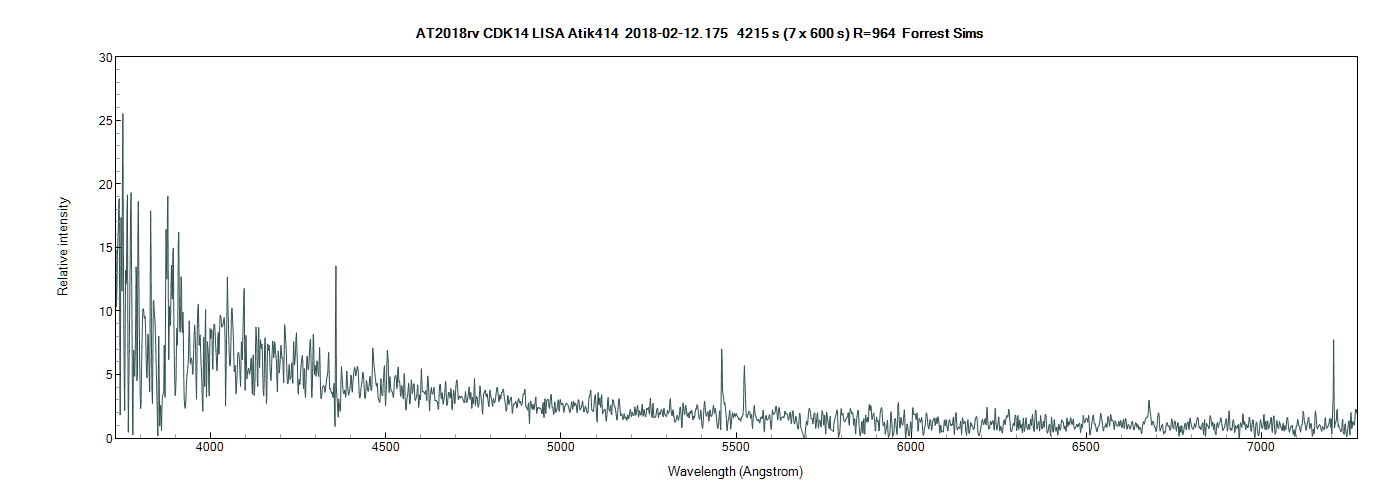 I thought I would have a go at this target before the clouds set in on Sunday night. It was difficult to find at this magnitude. Part of the problem I had was where exactly to look. The Transient Name Server link gives an RA 10:15:39.90 and a DEC +73:26:04.83 but lower down in the link from Patrick Wiggins is the Value of DEC of +73:26:08.83. So I do not know if one or the other was a typo or just an updated value. Using the AAVSO chart tool I was able to find a star very close to this location which is also very close to the location SIMBAD lists for CP Dra and that is RA 10:15:39.84 and DEC +73 26 05.0. I took up to 30 sec exposures at binning =2 with my LodestarX2 guide camera and one and only one star clearly showed at or near these positions. I was able to get it positioned on my LISA slit or maybe I should say in the slit and guided on the Mag 14.9 star AUID (000-BBR-295) at RA 10:16:05.79 and DEC 73:27:01.0.