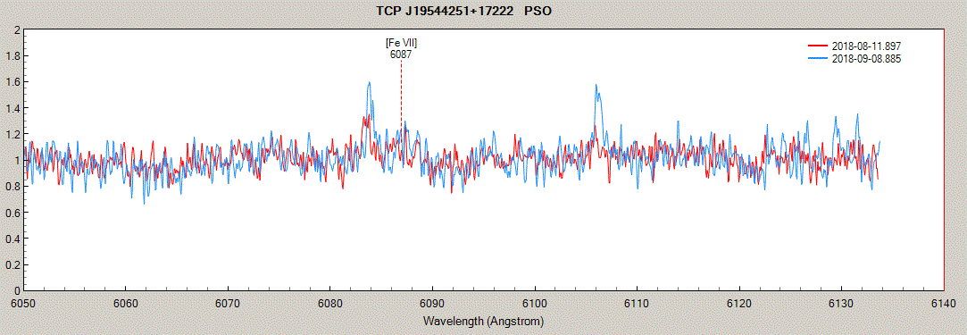 I think there's an anomaly with [Fe VIII] 6087. Last night's result at R~12000: There's a feature at 6084A which EW has approx. doubled (Olivier also has it), and the 3A difference to 6087 is suspicous (basic features don't have any shift).