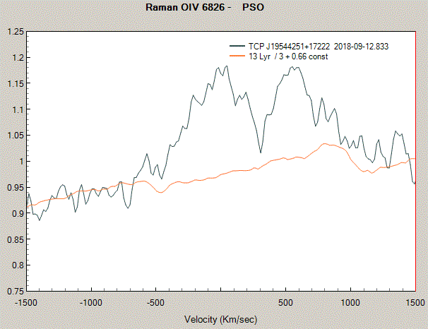 I have taken a closer look (9 x 10 min) with 12" Newton + LHires 600/mm grating + 35 micron slit at R~2700 at the Raman profile, and it is really double peaked (resembling to AG Peg): To elaborate M-ish features, I've taken 13 Lyr at the same R~2700 (normalised both targets), then estimated a 1/3 multiplier visually (tellurics included - please ignore [6870-7000A]), and added + 0.66 constant. It seems to fit well on the continuum. The RV distribution: Note that this feature is a hard target at this medium resolution, due to the high magnification factor required to acquire the real details.