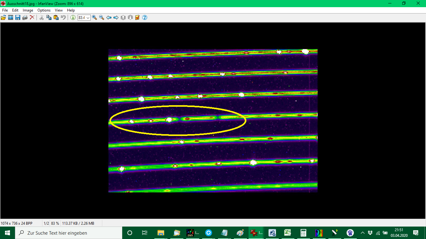 on vois deux spectra 2D consistant d’un spectre d’étoile (alf cam) et un spectre de ThAr superposé. Les distance des lignes de Na et des lignes de ThAr devrait etre le meme dans les deux spectres. Mais on voit la distance de Natrium et de ThAr n’est pas la meme. Quelle pourrait etre la raison. En chacun cas j’ai pris un spectre de ThAr et apres cela un spectre d’étoile.