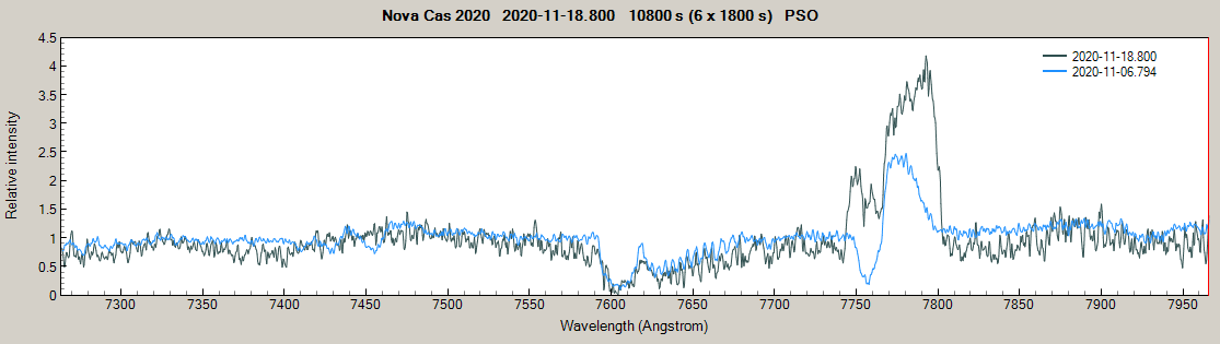 Nova Cas 2020 continues to change rapidly and is well worth following. Here are recent flux calibrated spectra taken just two days a part. Nova Cas 2020 has dimmed by nearly 3 magnitudes in the V band in the past week.