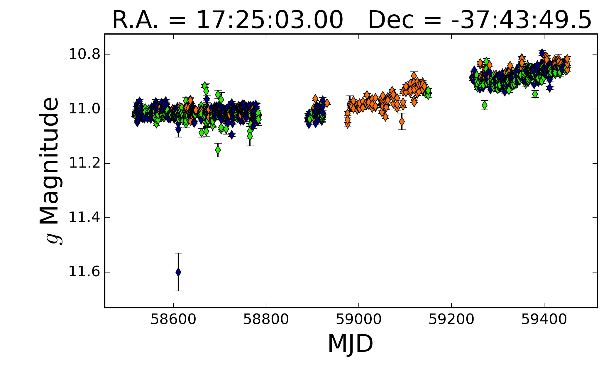 Here is the the light curve for the coordinates which I have retreived from the ASAS-SN survey: