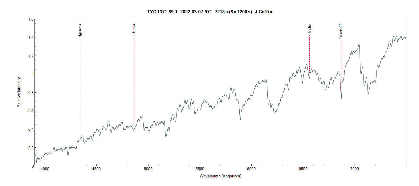 Here is a spectrum of TYC 1371-69-1 from last night using an Alpy 600, Celestron 8 SCT, 1200s x 6. I can't see any Balmer lines in emission.