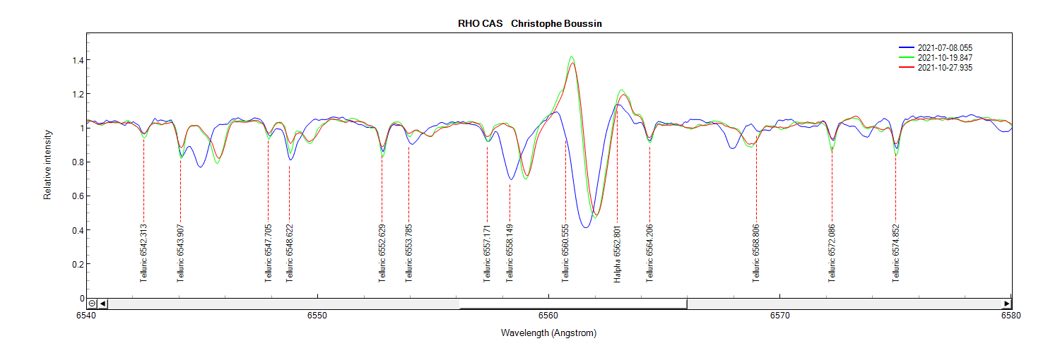 I obtained previously a high resolution spectrum around the Halpha line of Rho Cas on July 8 at 1 h 20 TU (resolution of 17942, JJ = 2459403.5552, 6 x 600s) and recently two new spectra on October 19 at 20 h 19 TU (resolution of 19325, JJ = 2459507.3467, 7 x 600s), and on October 27 at 18 h 35 TU (resolution of 18778, JJ = 2459515.435, 6 x 600s) with my LHIRES III (grating of 2400 lines / mm).