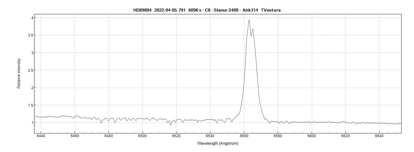 Hello everybody. As soon as the weather allowed it and while working from the balcony of the house I threw myself headlong on the shot of the star HD 89884 which is located in the constellation of Hydra. This time I tried to take a star of mag 8-9 but in the portion of the sky that I find myself I found only this one which is mag. 7.13. In the rush to operate I chose to do 600 s poses but as my dear friends pointed out to me, they suggested for the next time to adopt at least 960 s due to the 2400 l / mm grating. It is always a Be star with a clear double peak of emission in Halfa. Excuse me if I have dwelt but I got quite excited with the new spectroscope which seems to work very well!