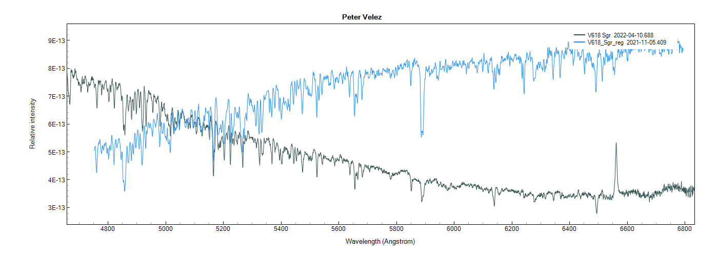 I had a look back at my last spectrum of V618 Sgr which was taken in November 2021. Here is a plot of both.