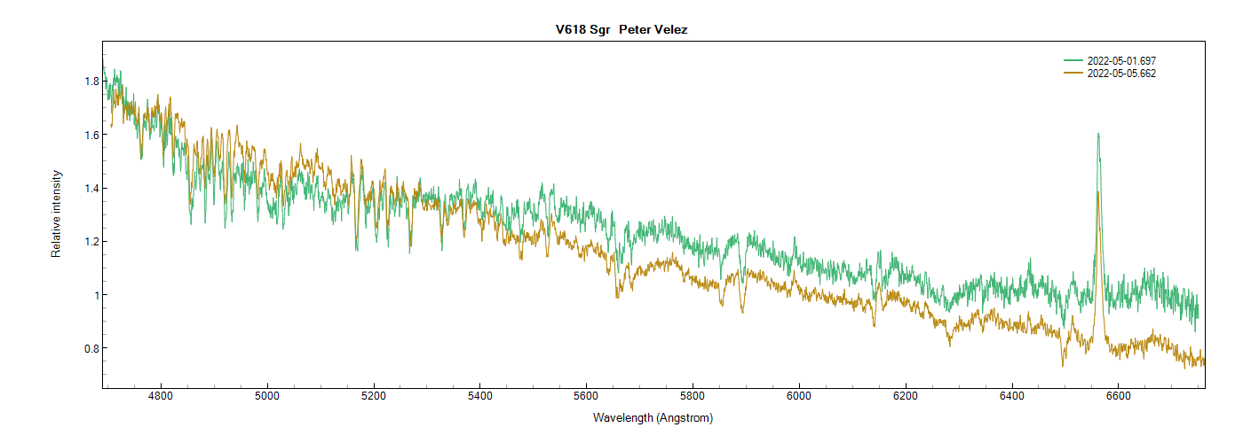 I've been keeping an eye on it of late. I adjusted the grating angle for the UVEX from the Hb - Ha range to the UV/Blue this week. Here is a comparison between 9 and 17 May 2022. Disregard the continuum as my reference star was not well selected. What is clear is the way the emissions have popped in the space of a week.