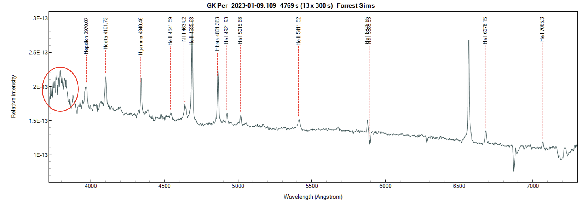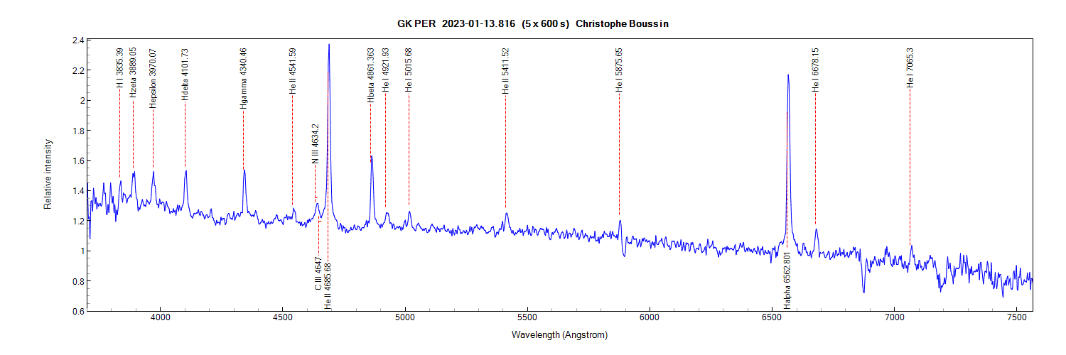 Here is my cropped, flux calibrated spectrum of GK Per for 2023-01-09 UT taken with a Shelyak LISA. Balmer emission lines, NIII, He II, and numerous He I lines plus the Sodium D absorption lines are all present. The blended line near 4640Å would appear to be a blend of NIII 4634.2Å and CIII at 4647Å.