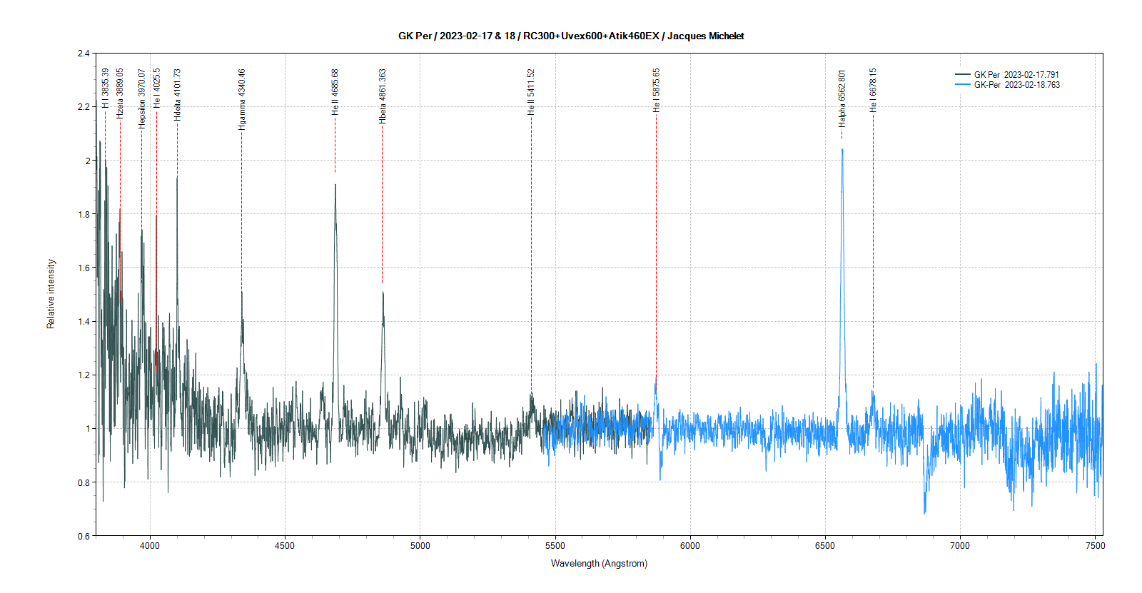 I obtained a new spectrum of GK Per with my Alpy 600 on 15 February at 20:28 UT (resolution of 520, JJ = 2459991.3942) with an acquisition time of 80 min (8 x 600s) :