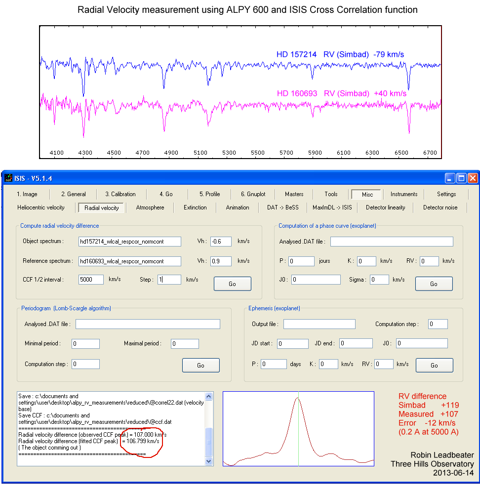 The results were excellent with the measured RV difference of 107 km/s only 12km/s in error from from the published value (Note there appears to be a sign error in ISIS)