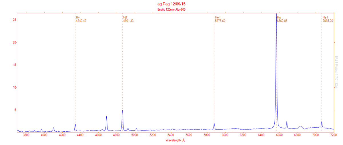 after shooting AG Pegasi by SA200, last Thursday we took the spectrum of the variable star by Dados 200 l/mm. The attachment shows the profile in the bandwidth 4800-6600 A, without correcting by istrumental response.