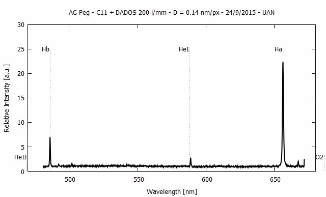 I send another AG Pegasi spectrum taken on September 10 by Celestron C11, mounted on 10 Micron GM2000HPS, plus CCD Atik 314L+ and Star Analyzer 200 l/mm. Dispersion of 7.436 A/pixel.