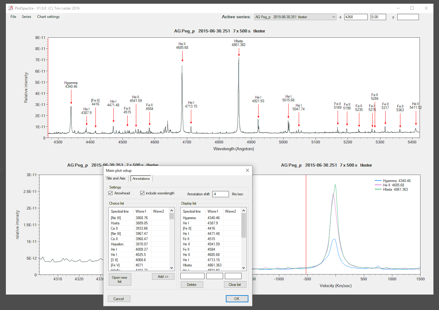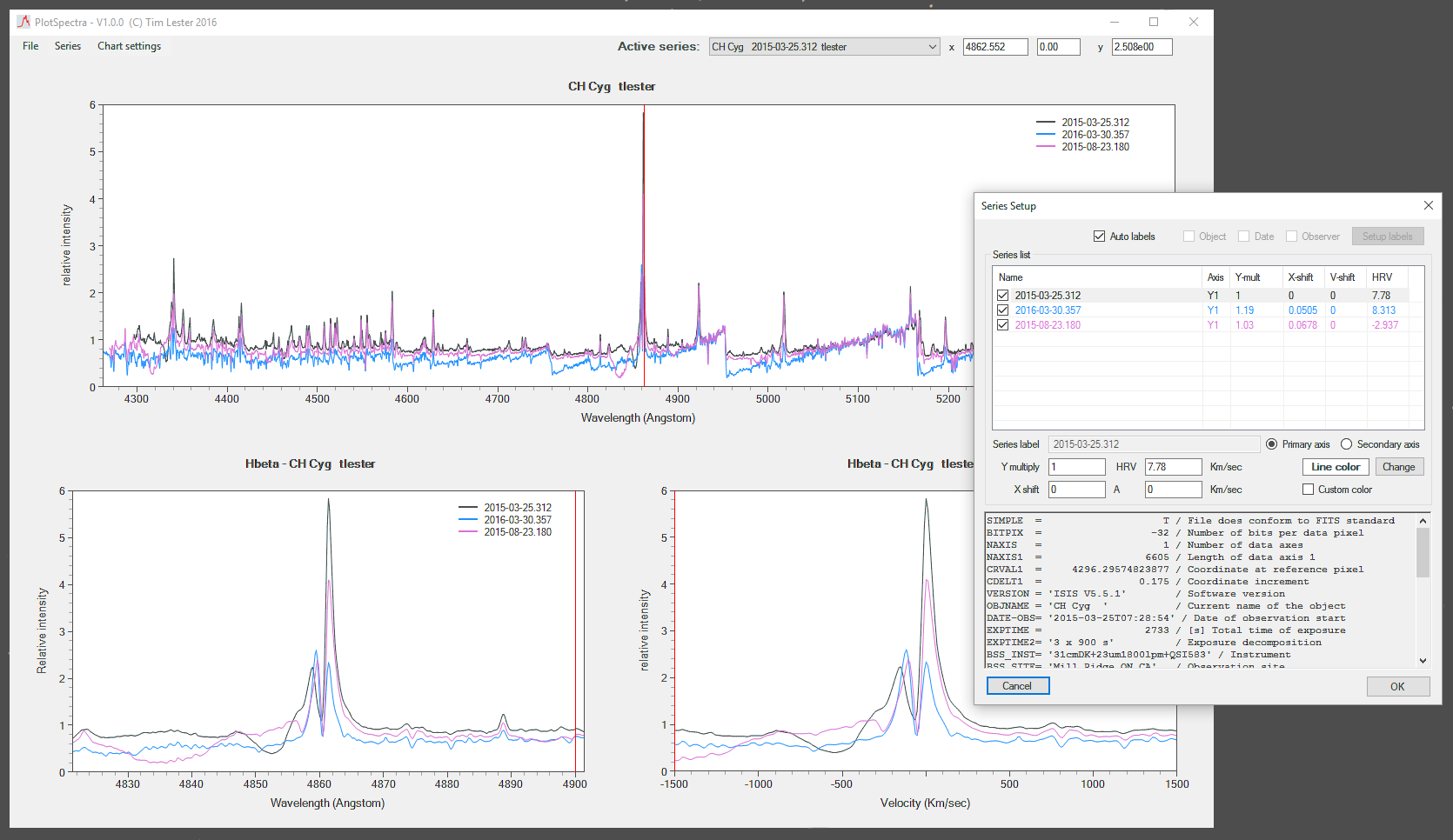 Working really well - thanks. I've been testing this on a series of 23 spectra of mu Sgr taken over the past few months. The quality of the output PNG files is particularly nice. I've discovered that the Series/Setup window provides a useful way to scroll through the fits headers of a large number of files. It would be nice if that window could be resized - though it's certainly not a show stopper by any means.