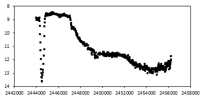 While looking at the 2D image of the spectrum, this objects had so many emission spikes I thoughts it could be a nova; see 2D image after Isis V1.90 processing: